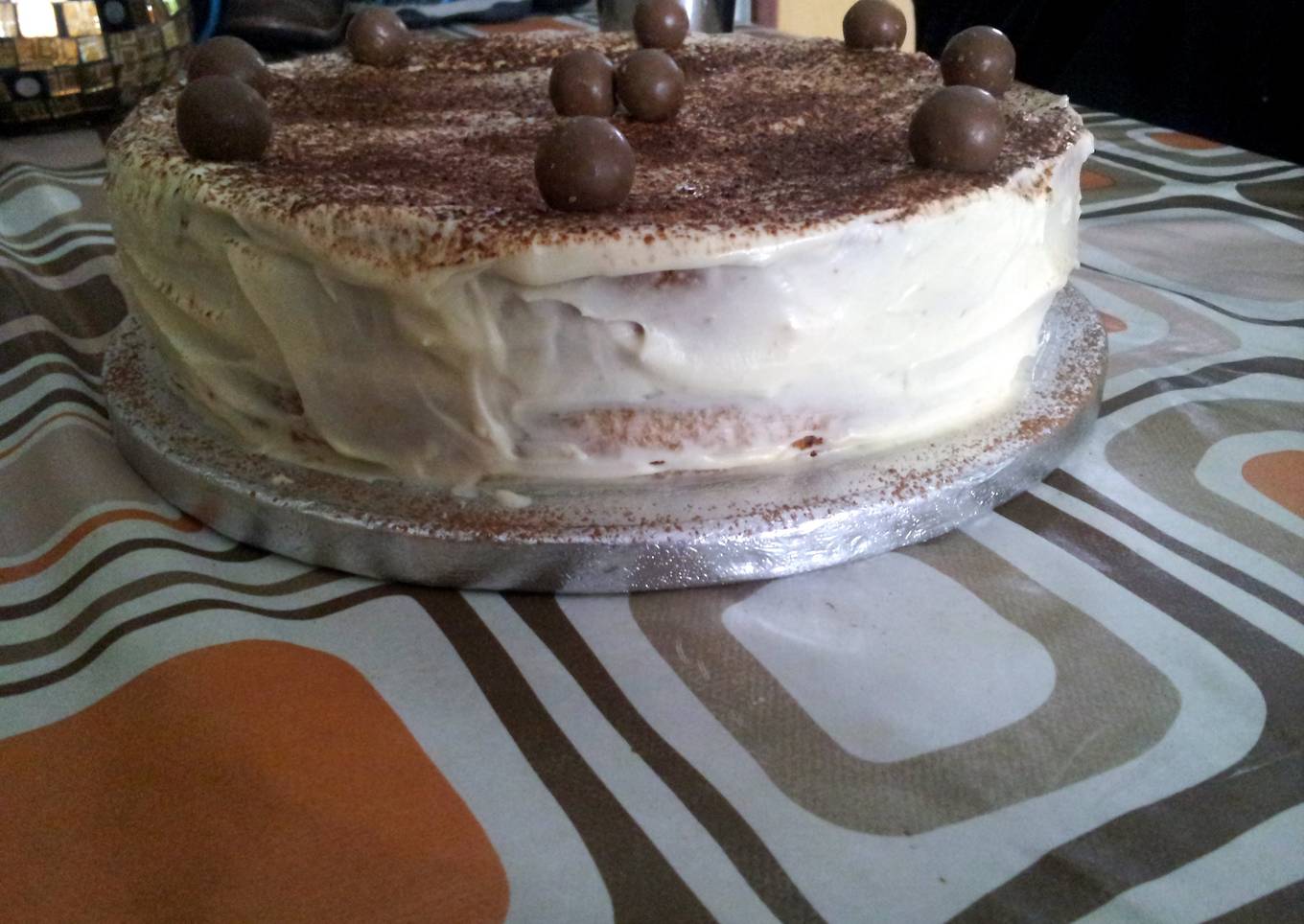 - Then sift cocoa powder on top and decorate with maltesers or your desired chocolates.